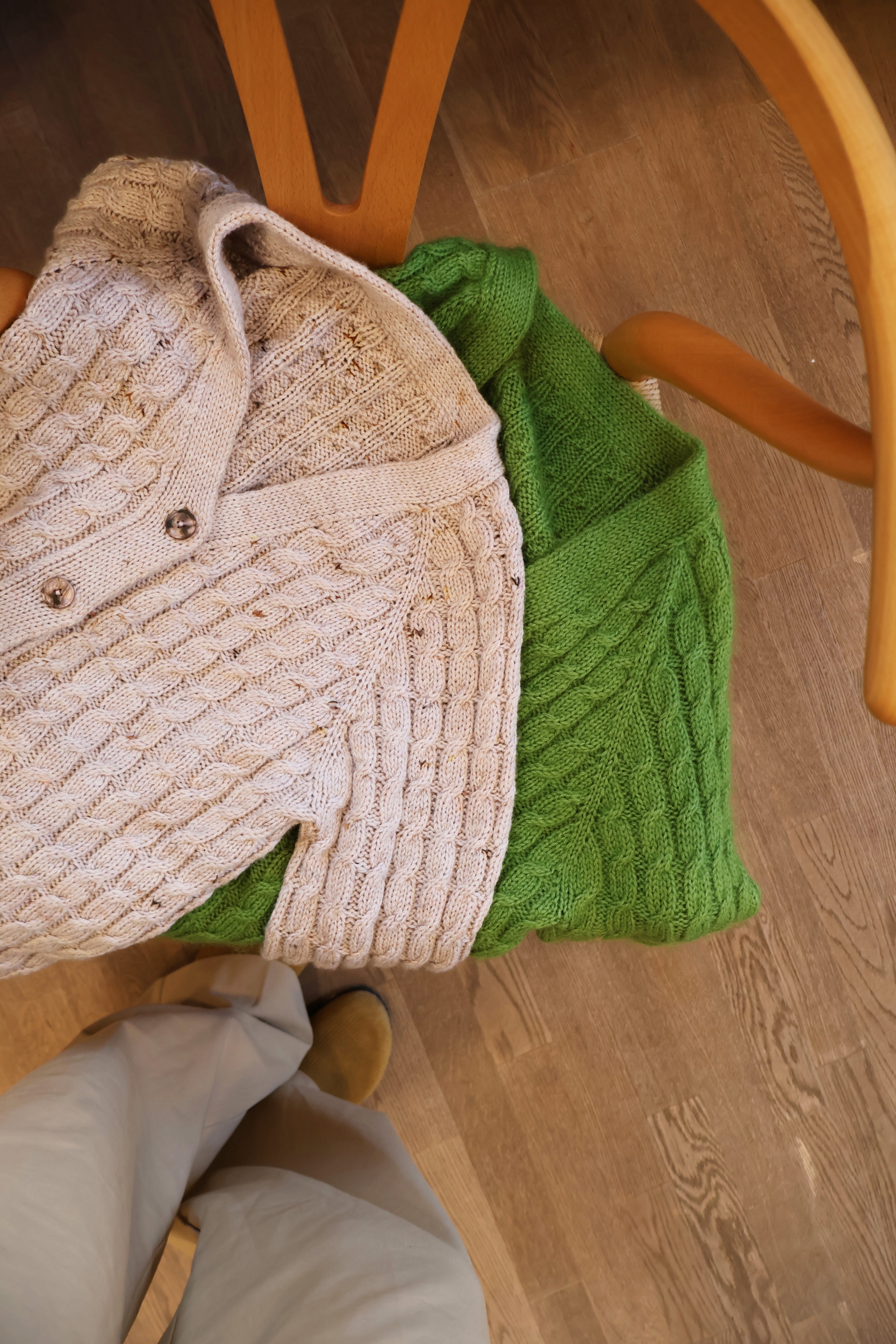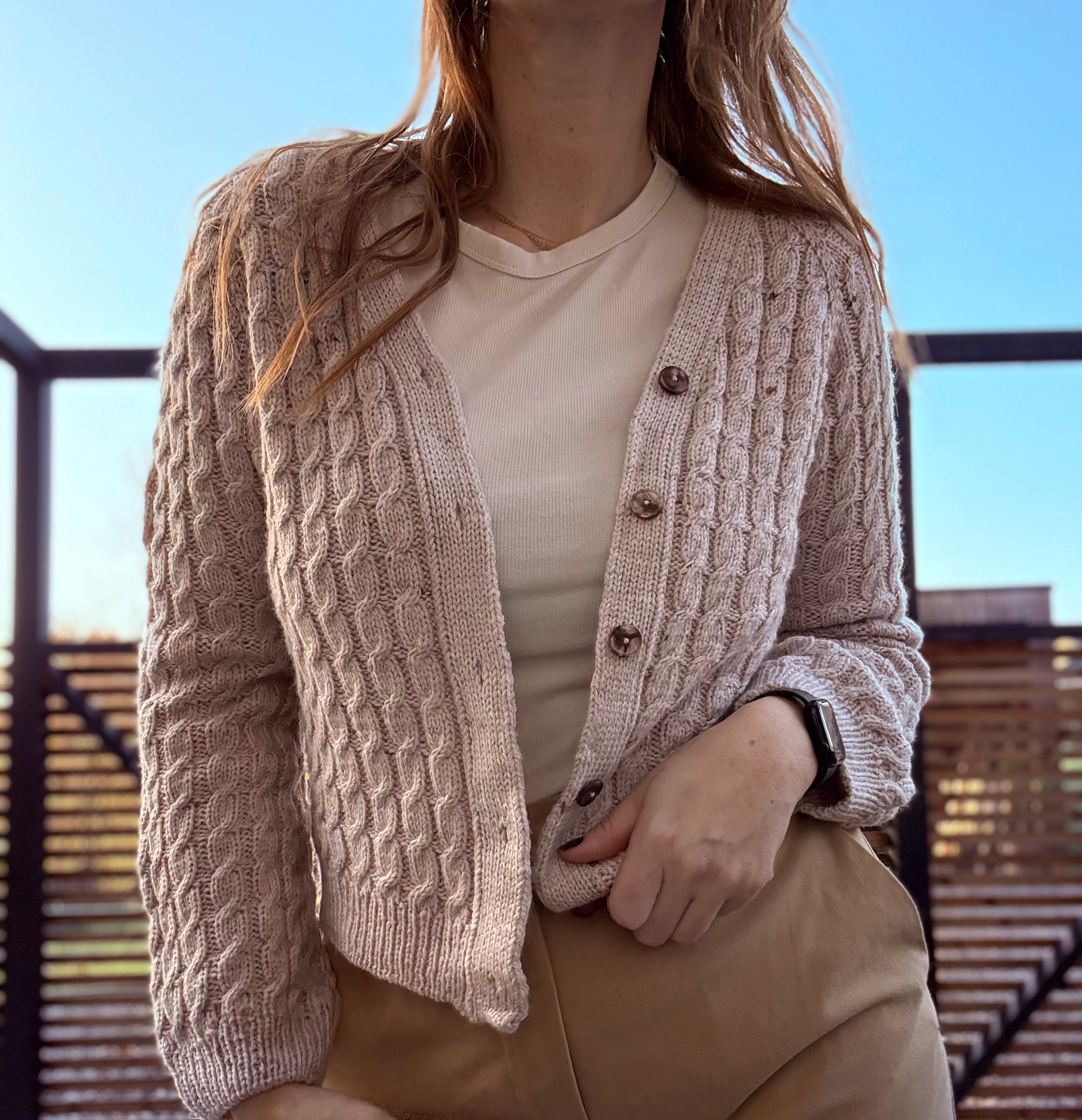 KÅS cardigan er en klassisk kabel cardigan med v-hals. Den strikkes oppefra og ned med raglanudtagninger. Til sidst strikkes knapstolpen på ved brug af dobbeltstrik metoden. Den har et relativt tæt fit med lige ærmer.