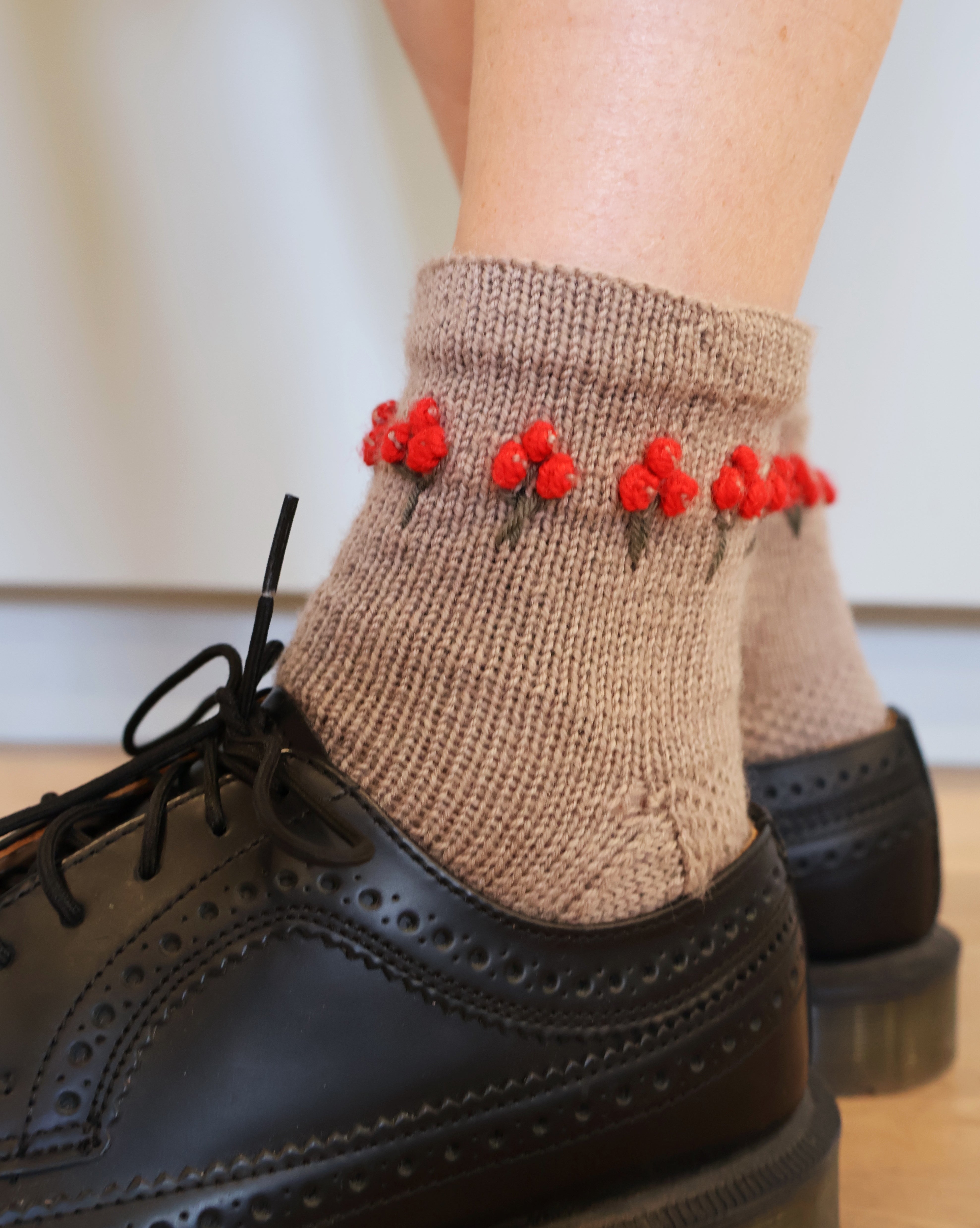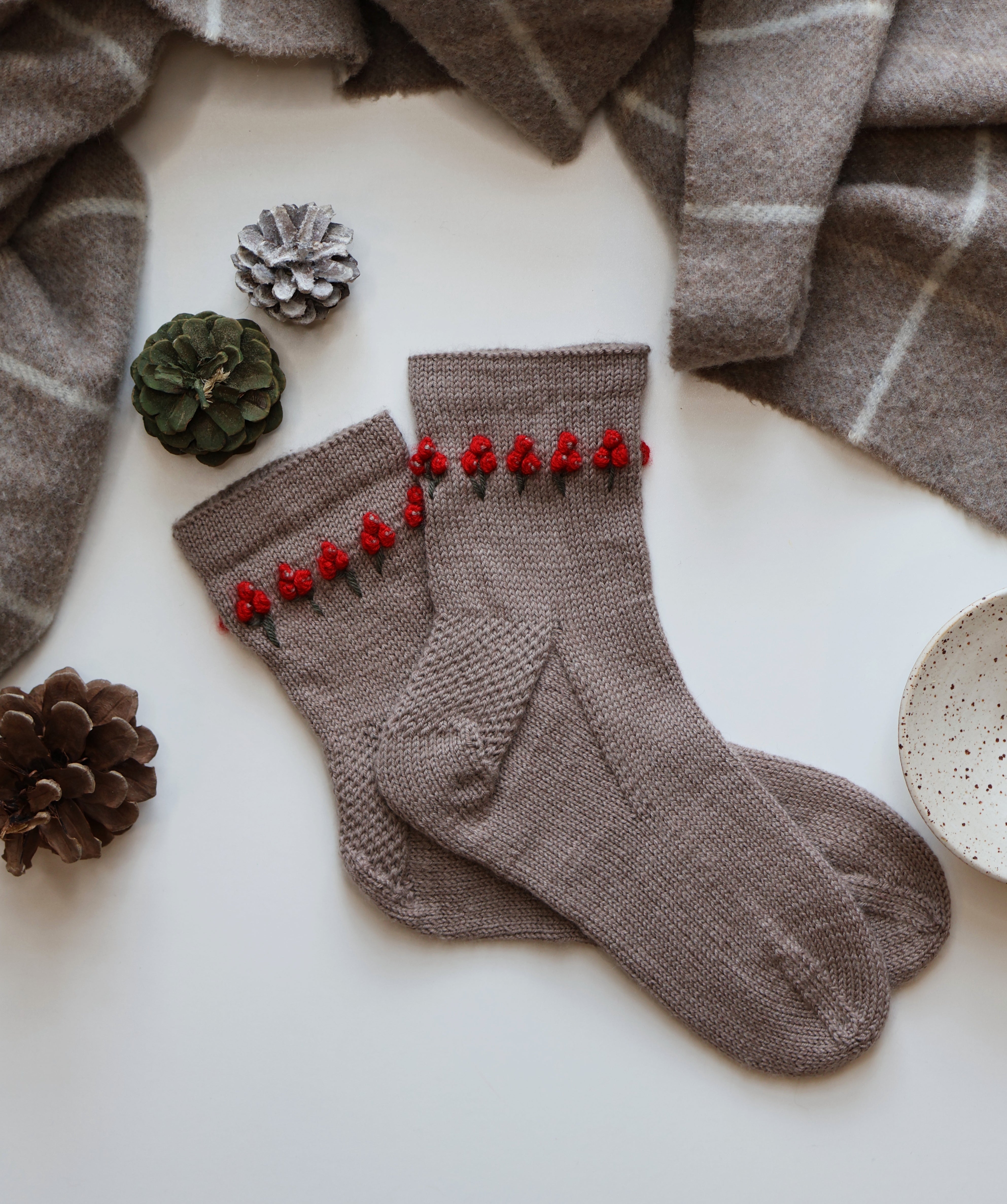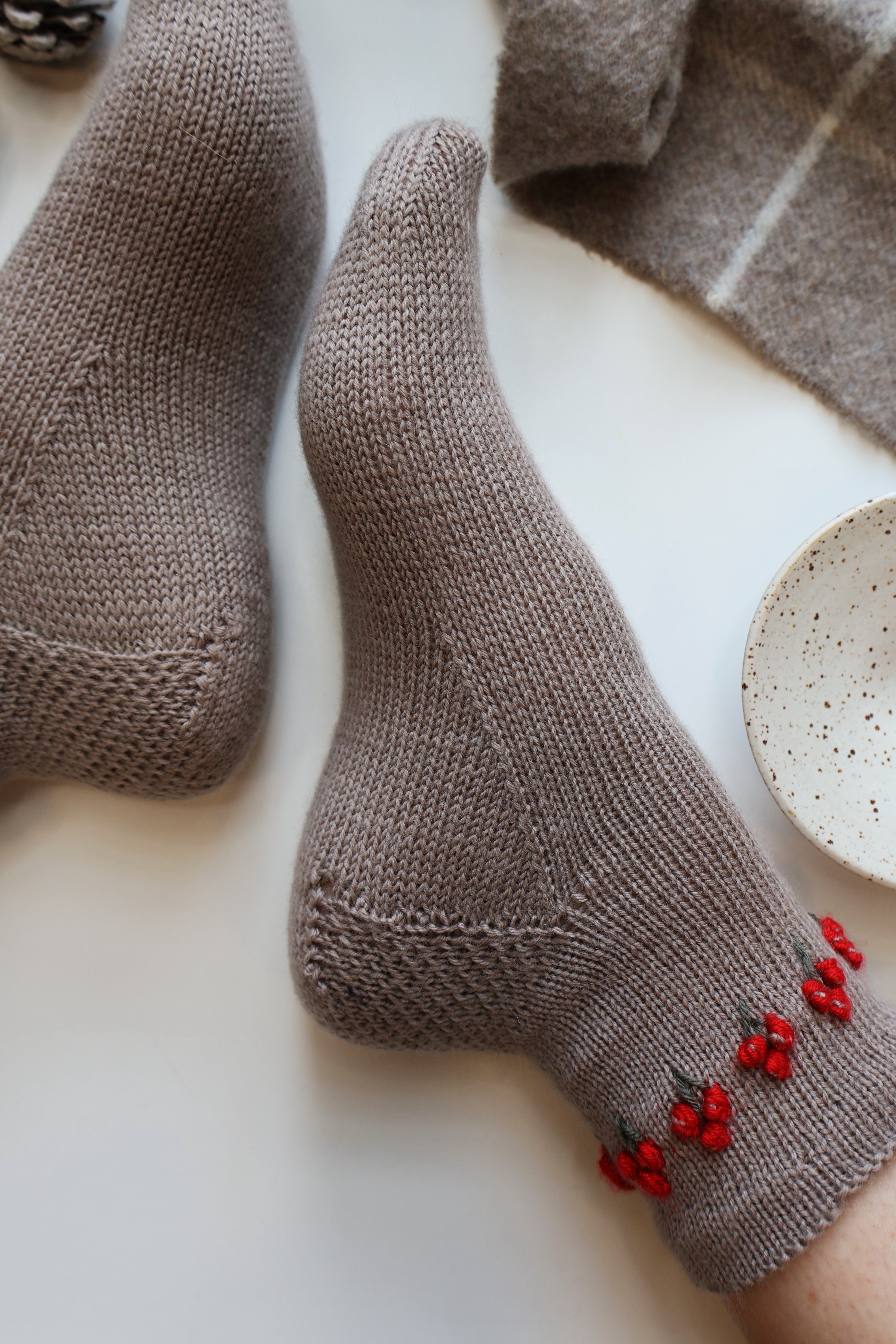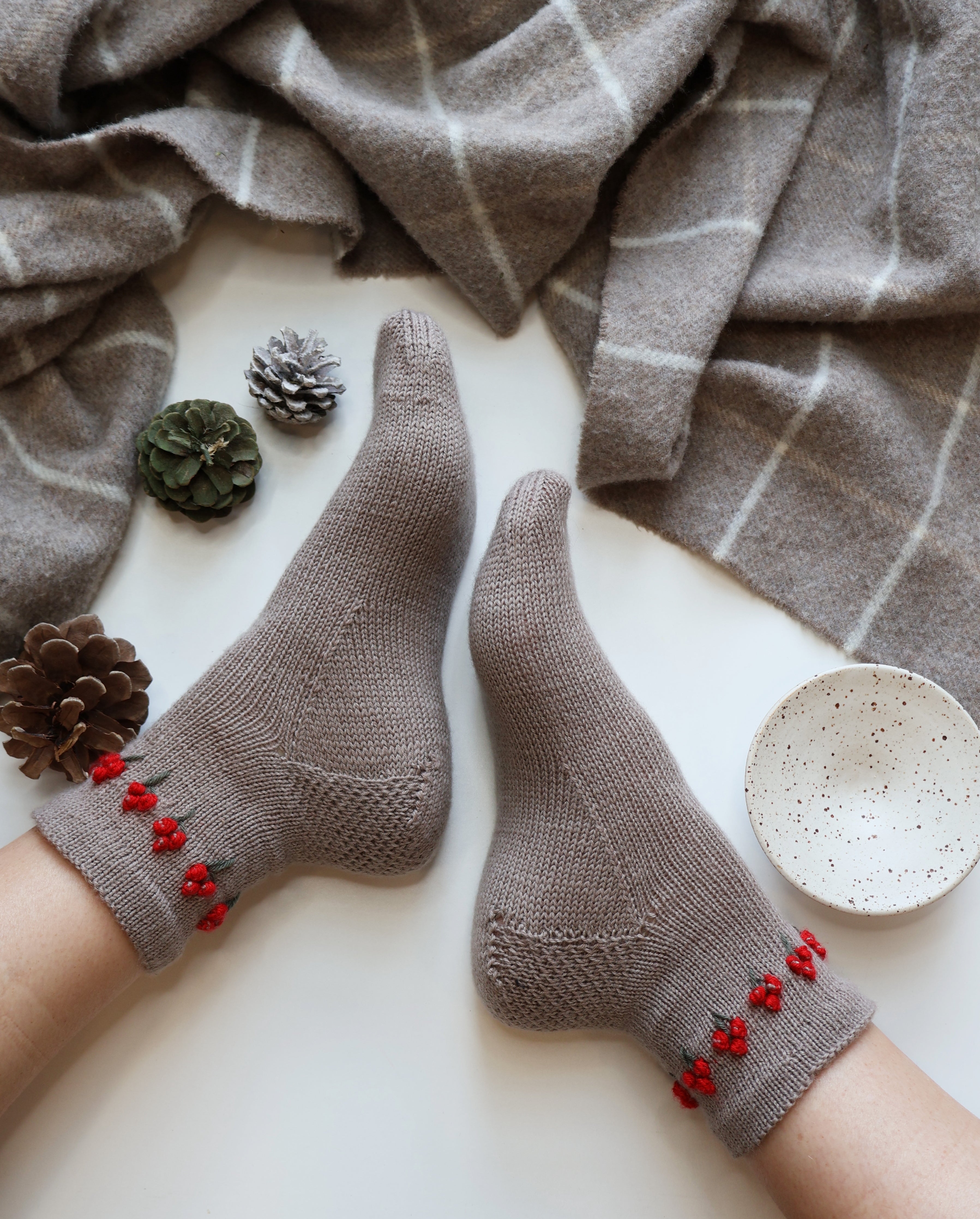 BERRY Socks is a beautiful and decorative sock in stockinette stitch featuring an interesting berry motif and a classy folded top.