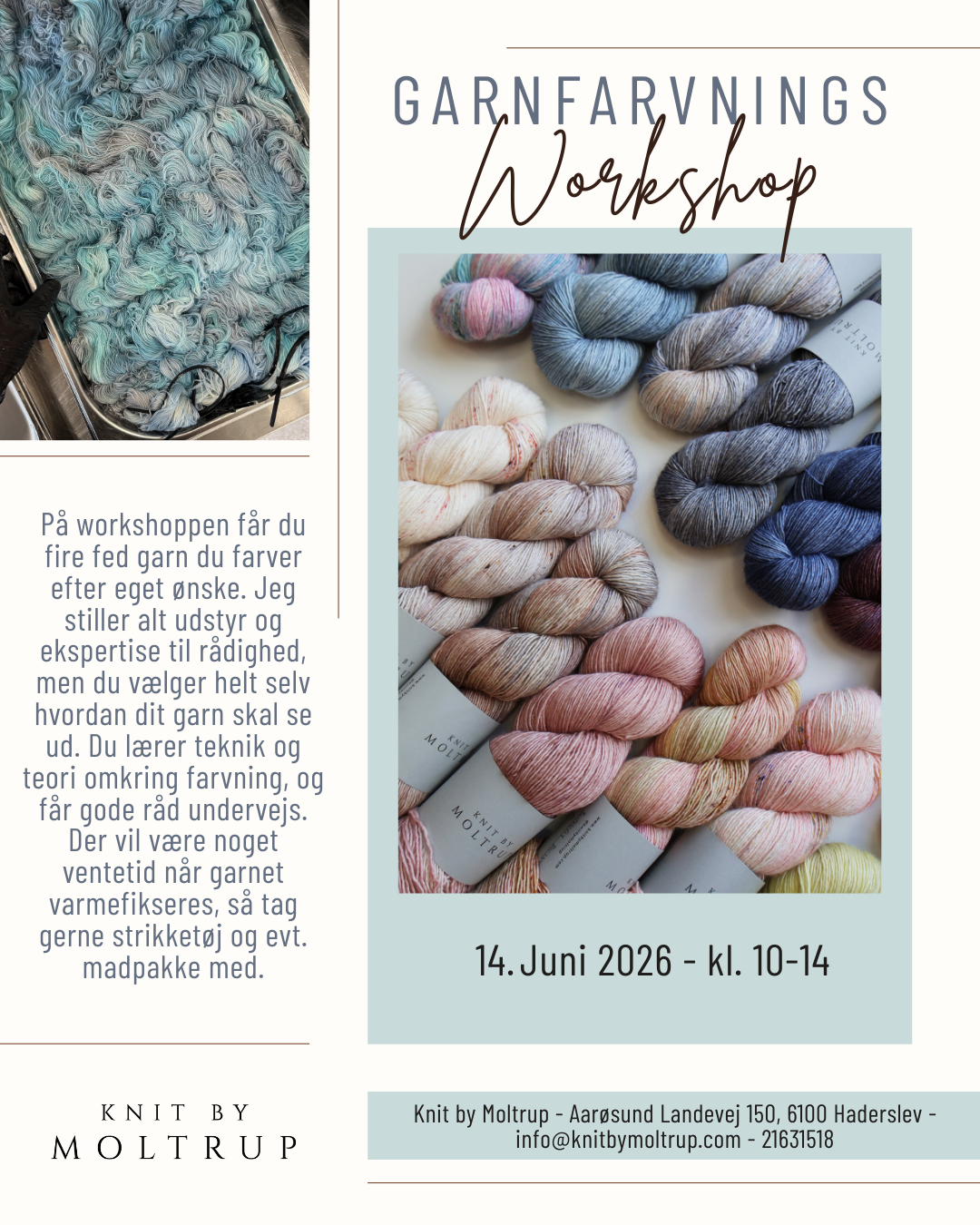 Så har du her muligheden for at farve fire fed garn i enten merino, mohair eller sock, under vejledning fra mig. Du er med i hele processen, og vælger selv farver og teknikker. Du får dit garn med hjem samme dag, og efter tørring er det klart til brug.