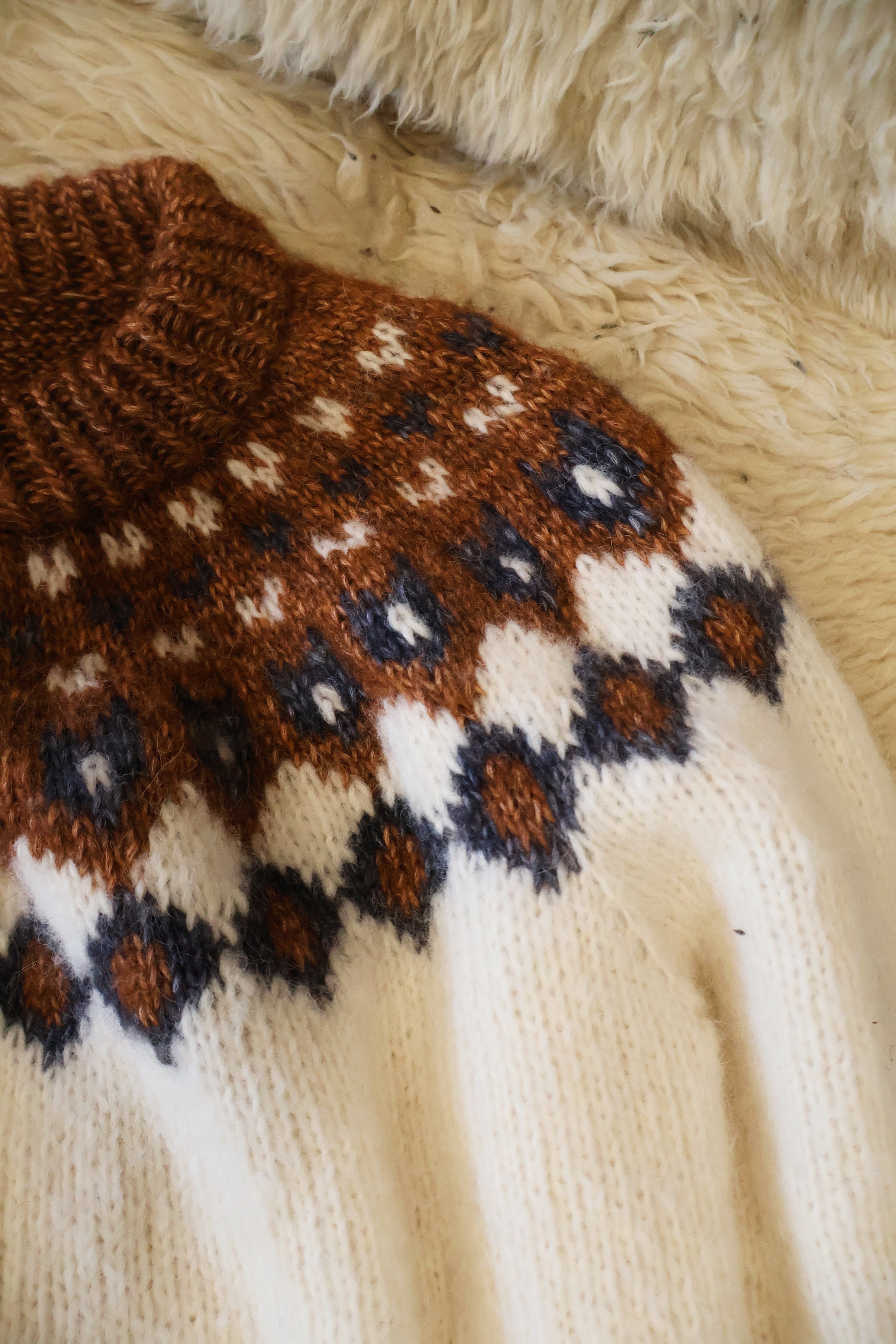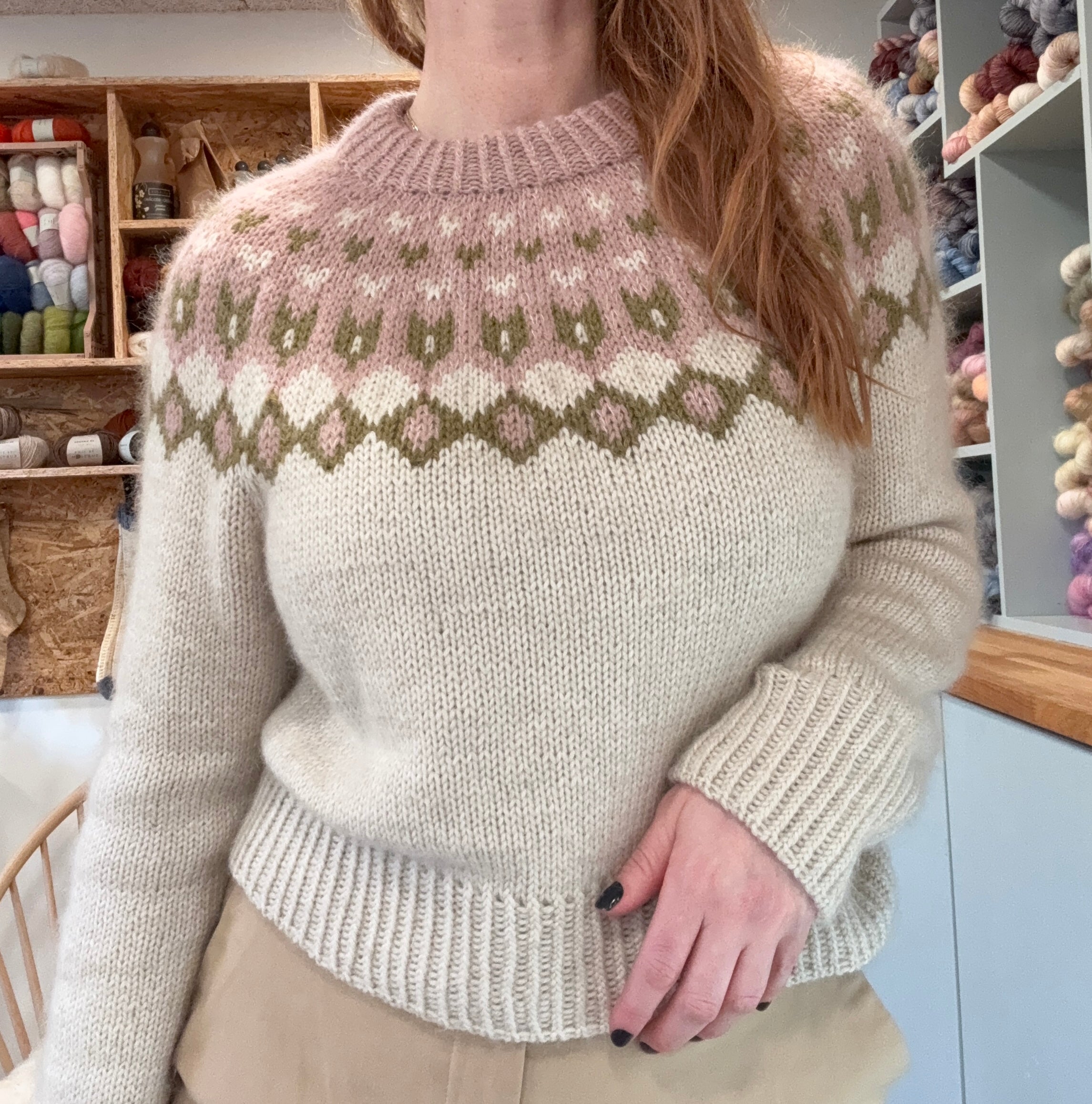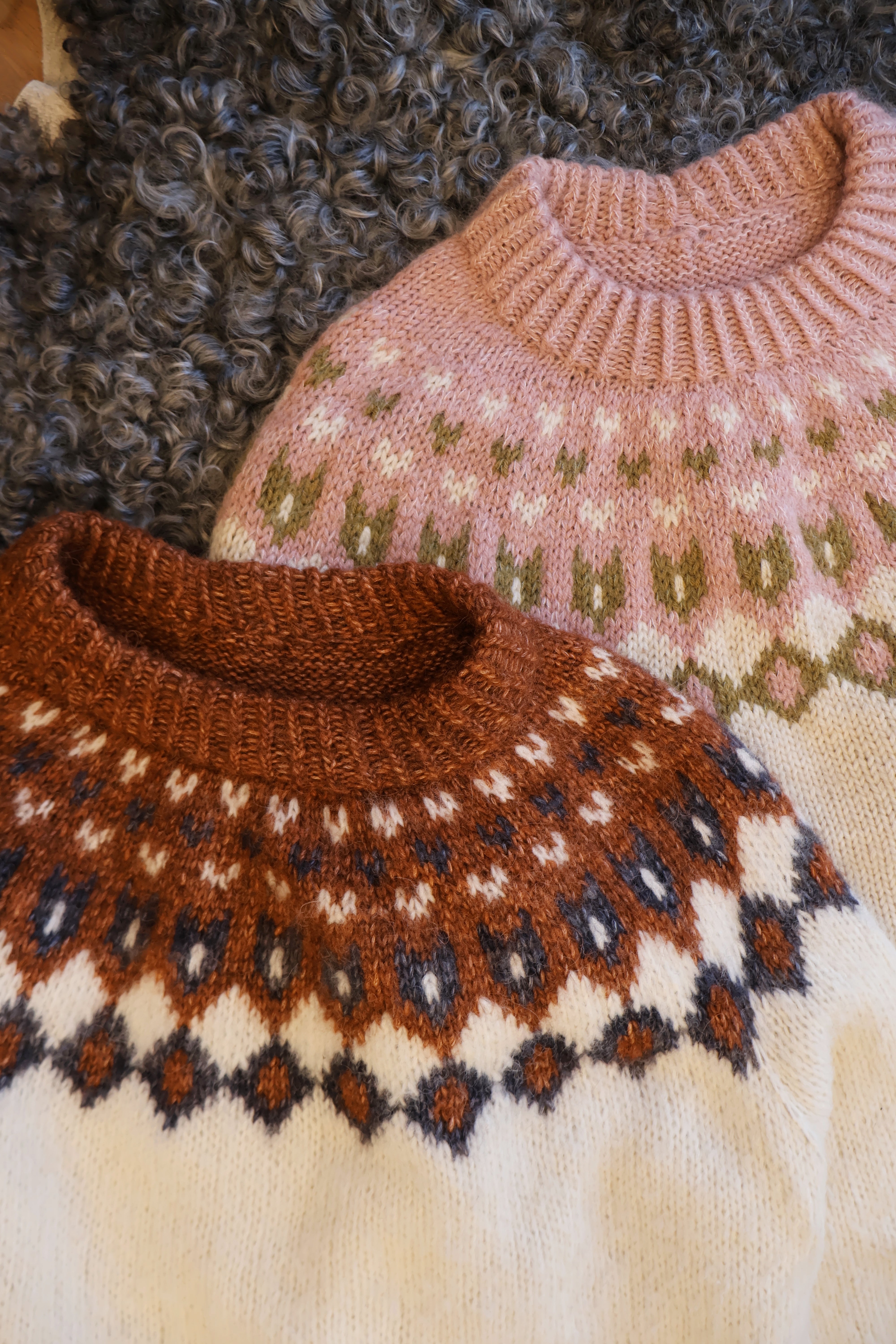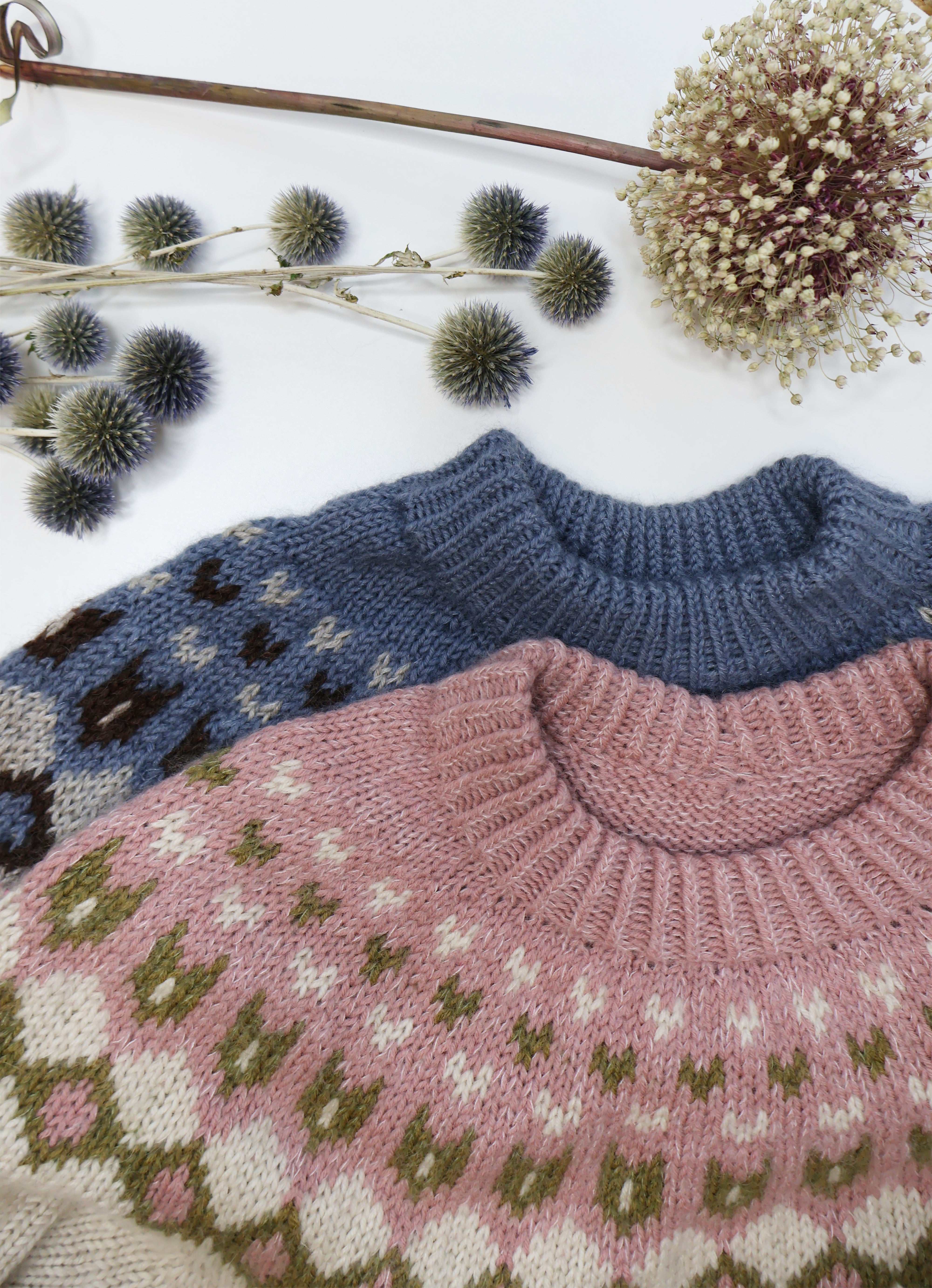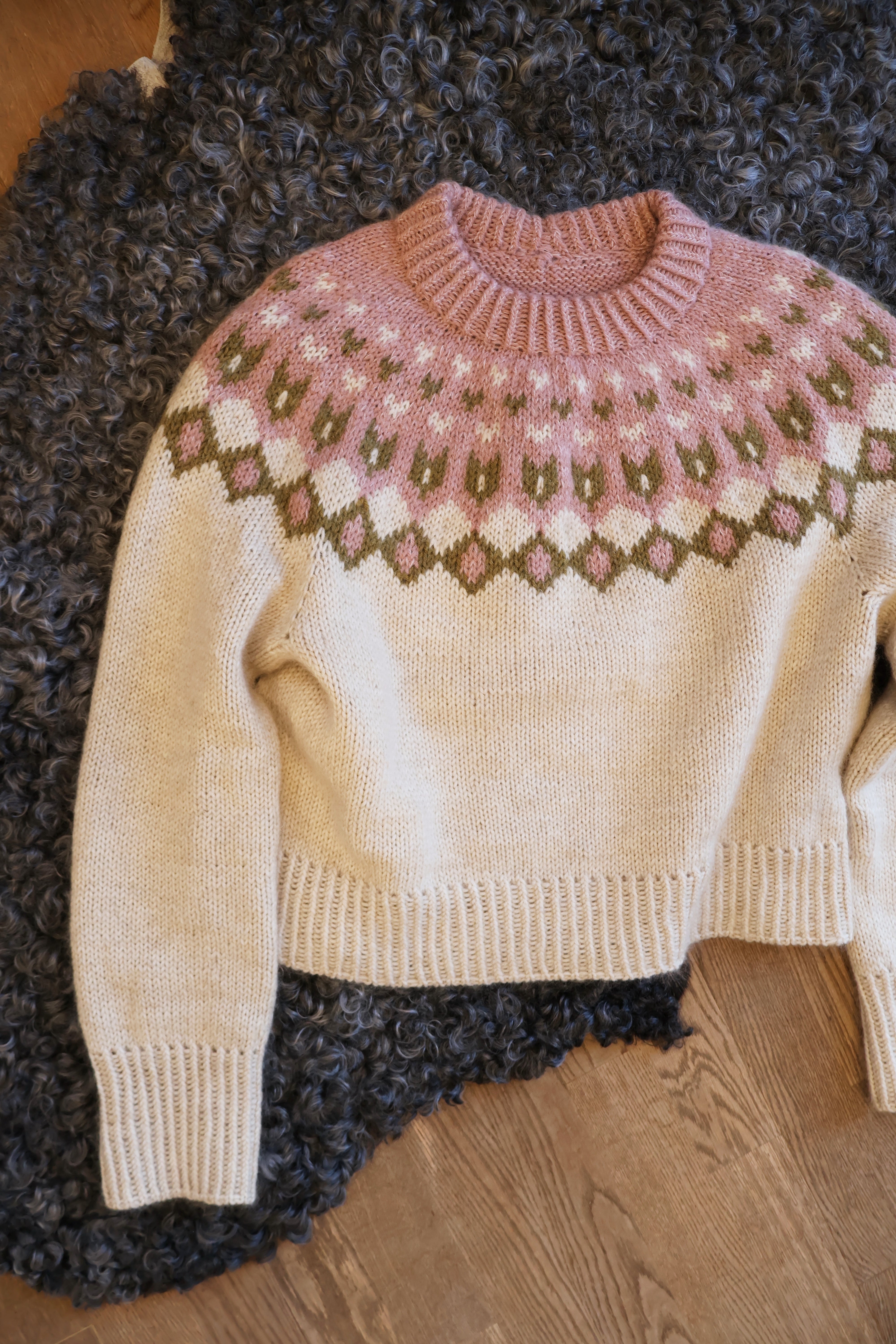 VESBORG Sweater er en klassisk sweater med mønsteret bærestykke, der først strikkes rundt, og derefter med raglanudtagninger for en bedre pasform. Der laves ydermere vendepinde i nakken, så den sidder bedst muligt. Sweateren afsluttes med lange drejede ribkanter og en foldet halskant.