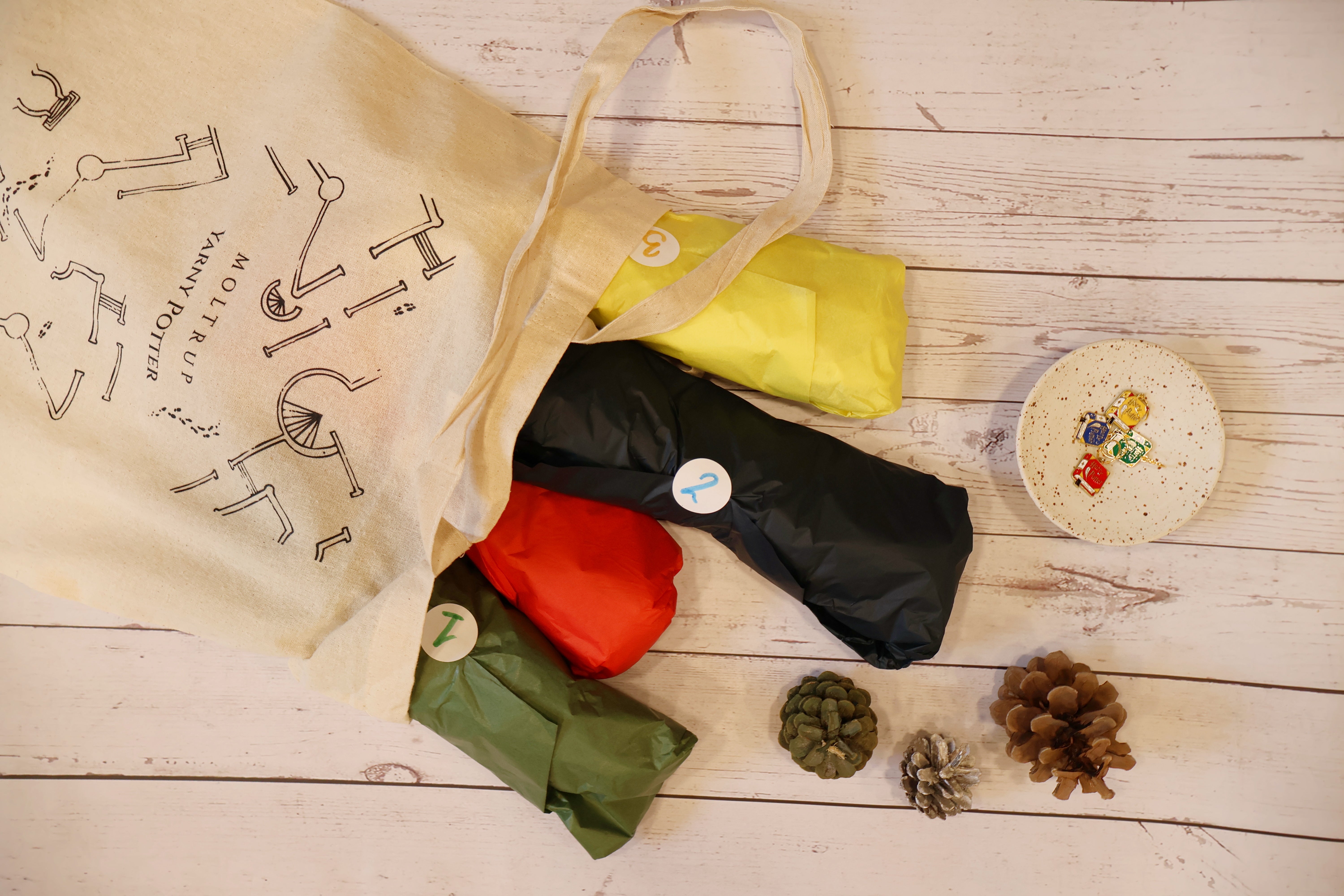 Det hele er pakket i en Yarny Potter mulepose, som kan bruges til at tage dine projekter med på farten.