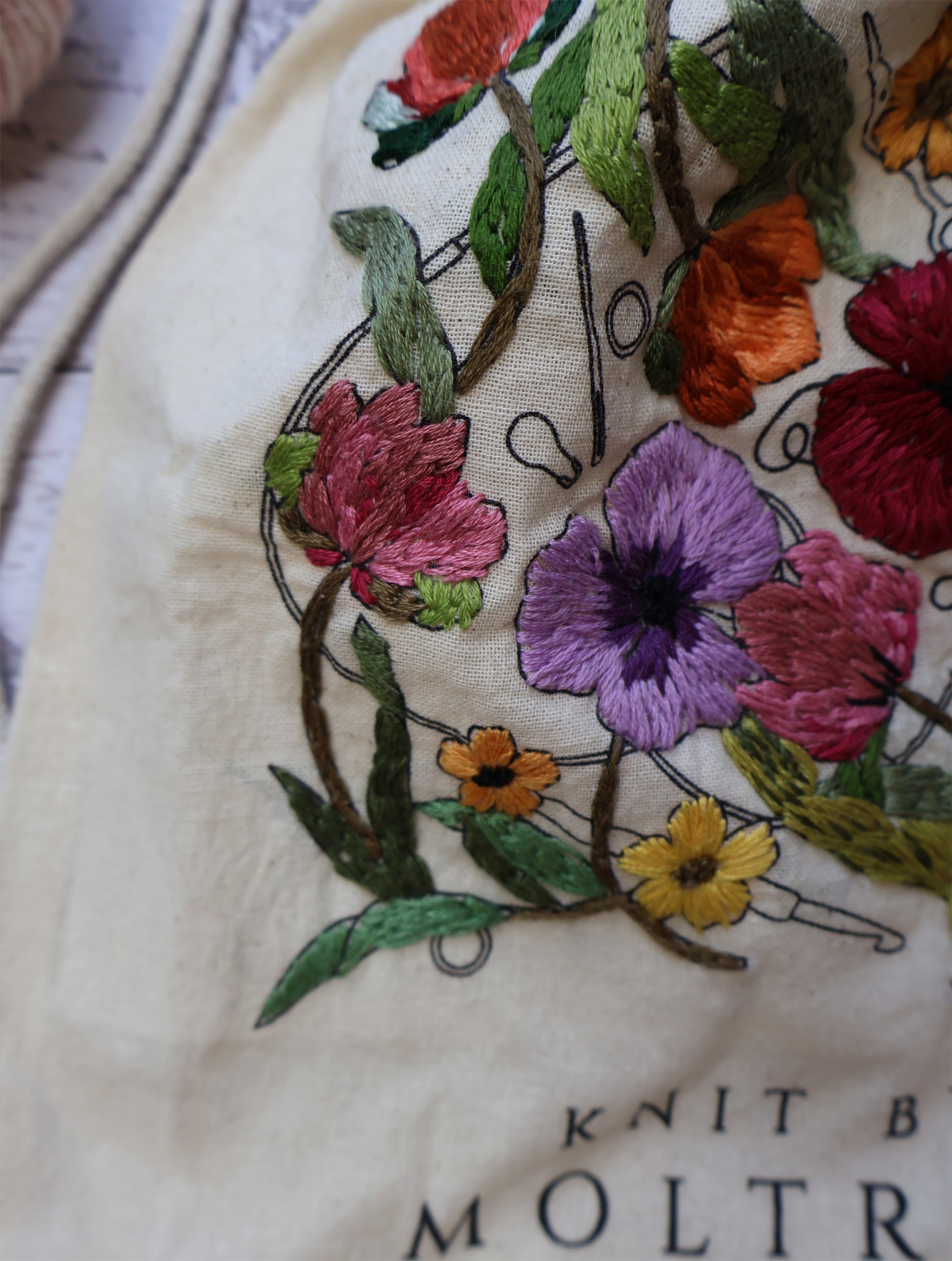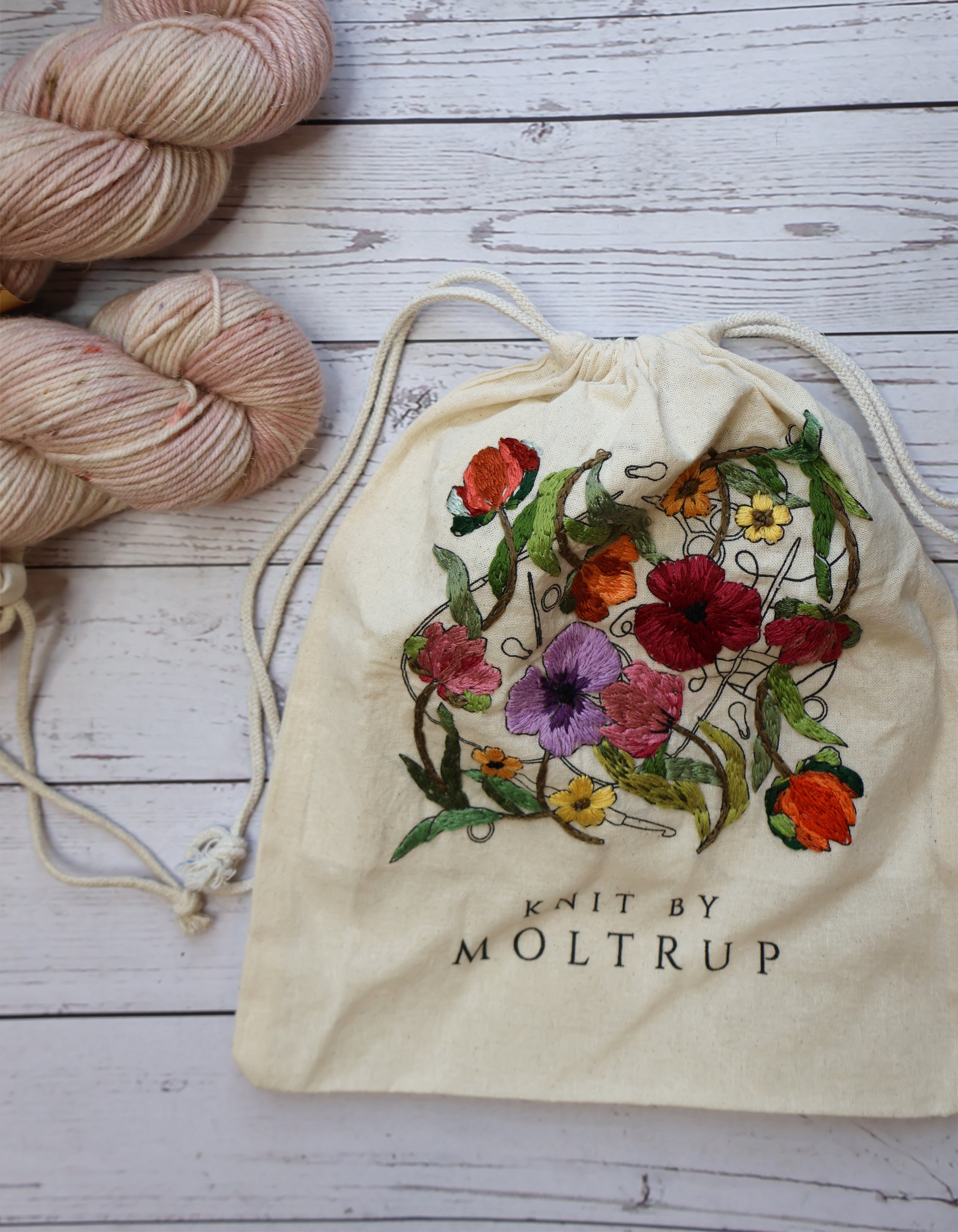 Lækker Knit by Moltrup projektpose i GOTS certificeret ufarvet bomuld med tryk.