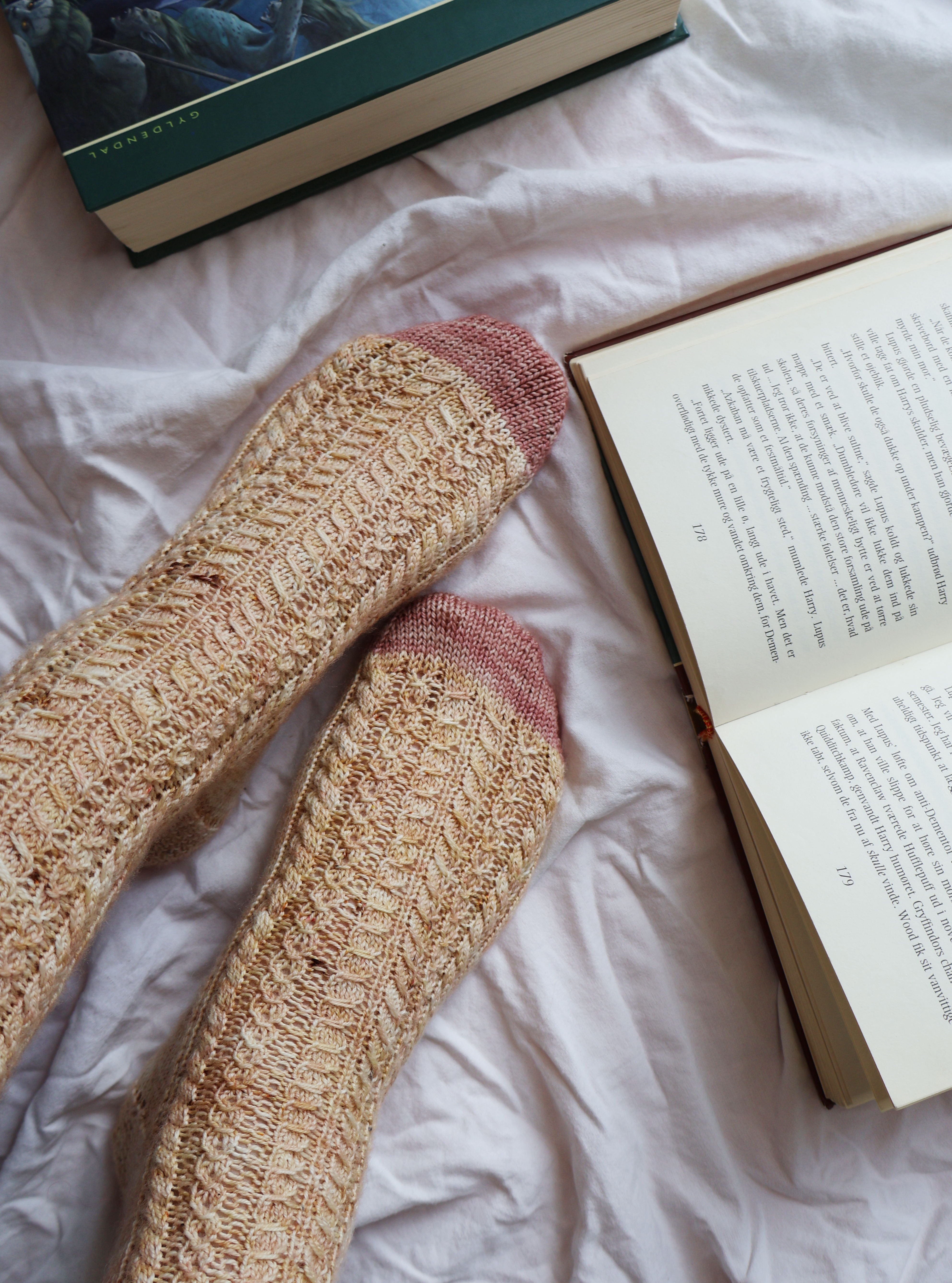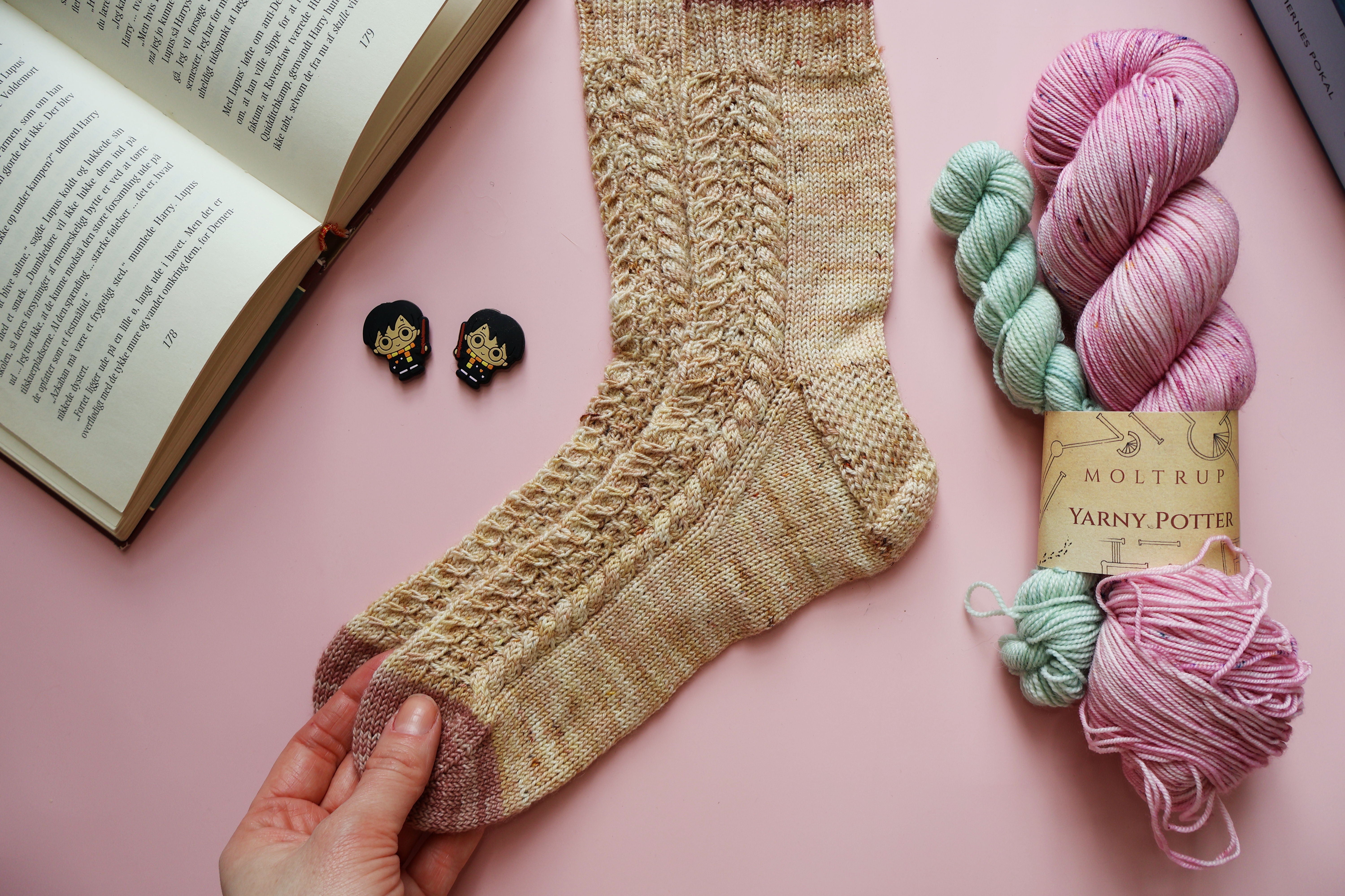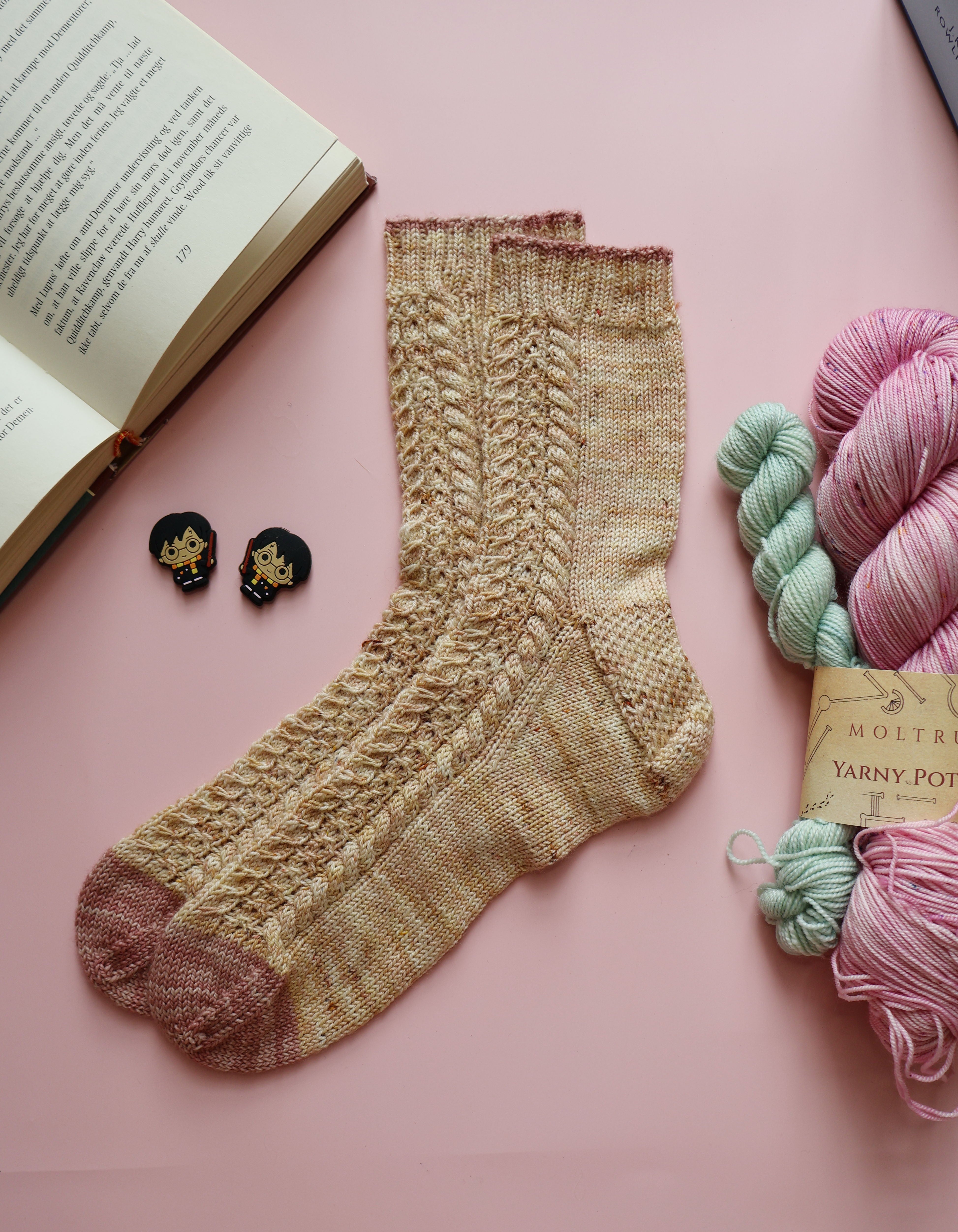 Potter Sock is a decorative cabled sock, that looks a lot more difficult than it really is. It’s worked cuff down with a double knitted heel flap. You can use a hand-dyed yarn, that isn’t too busy and still see the pattern.