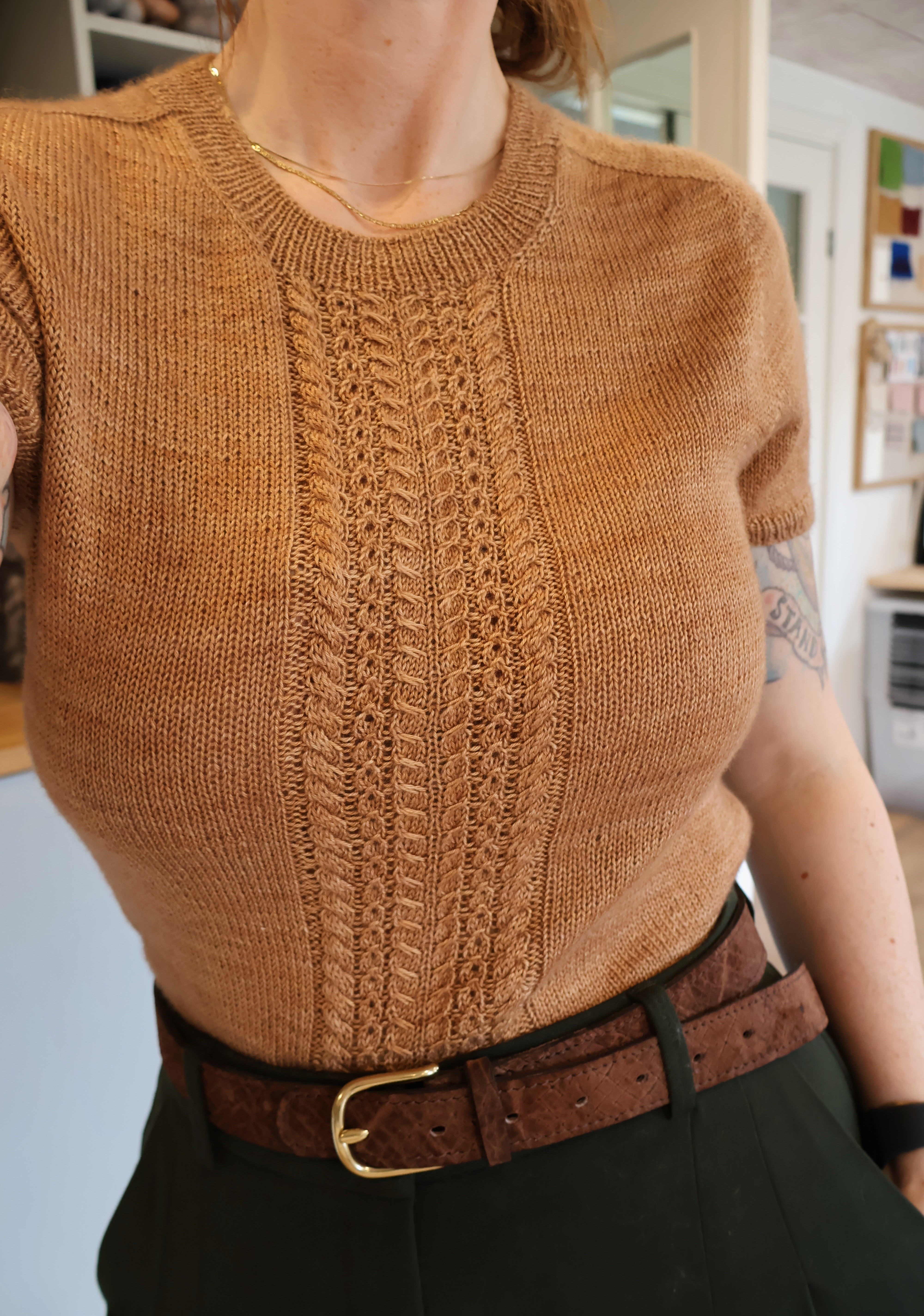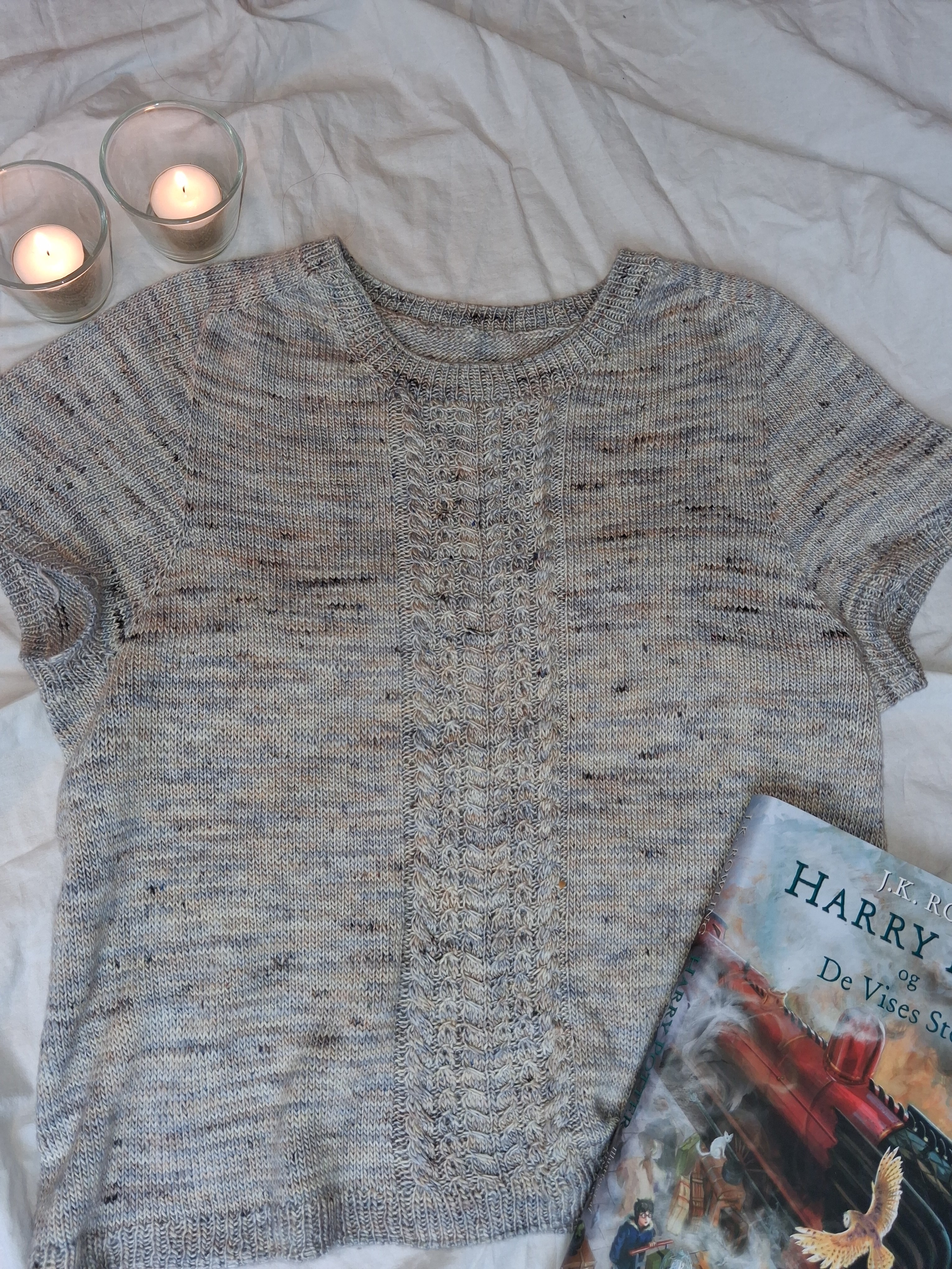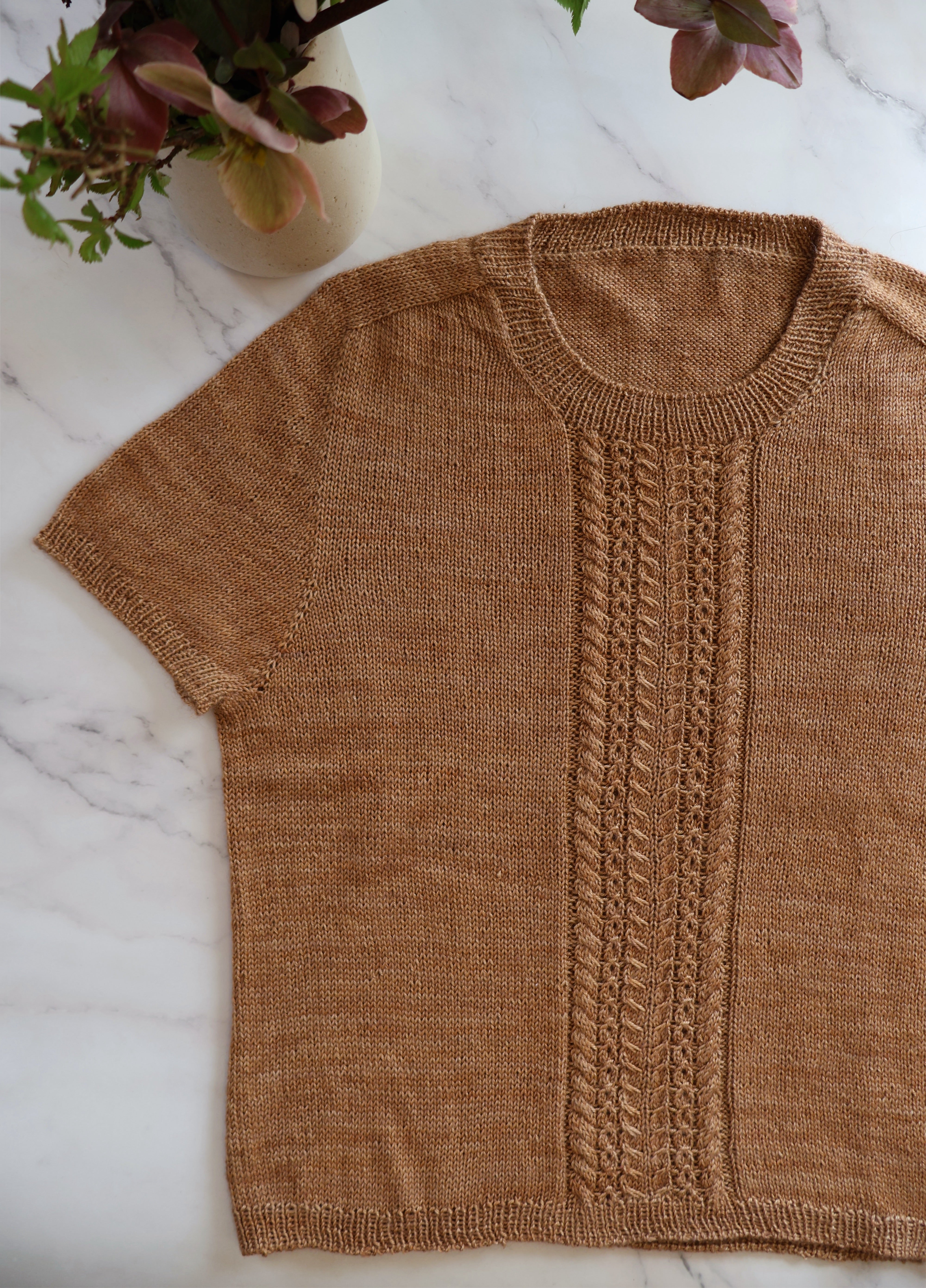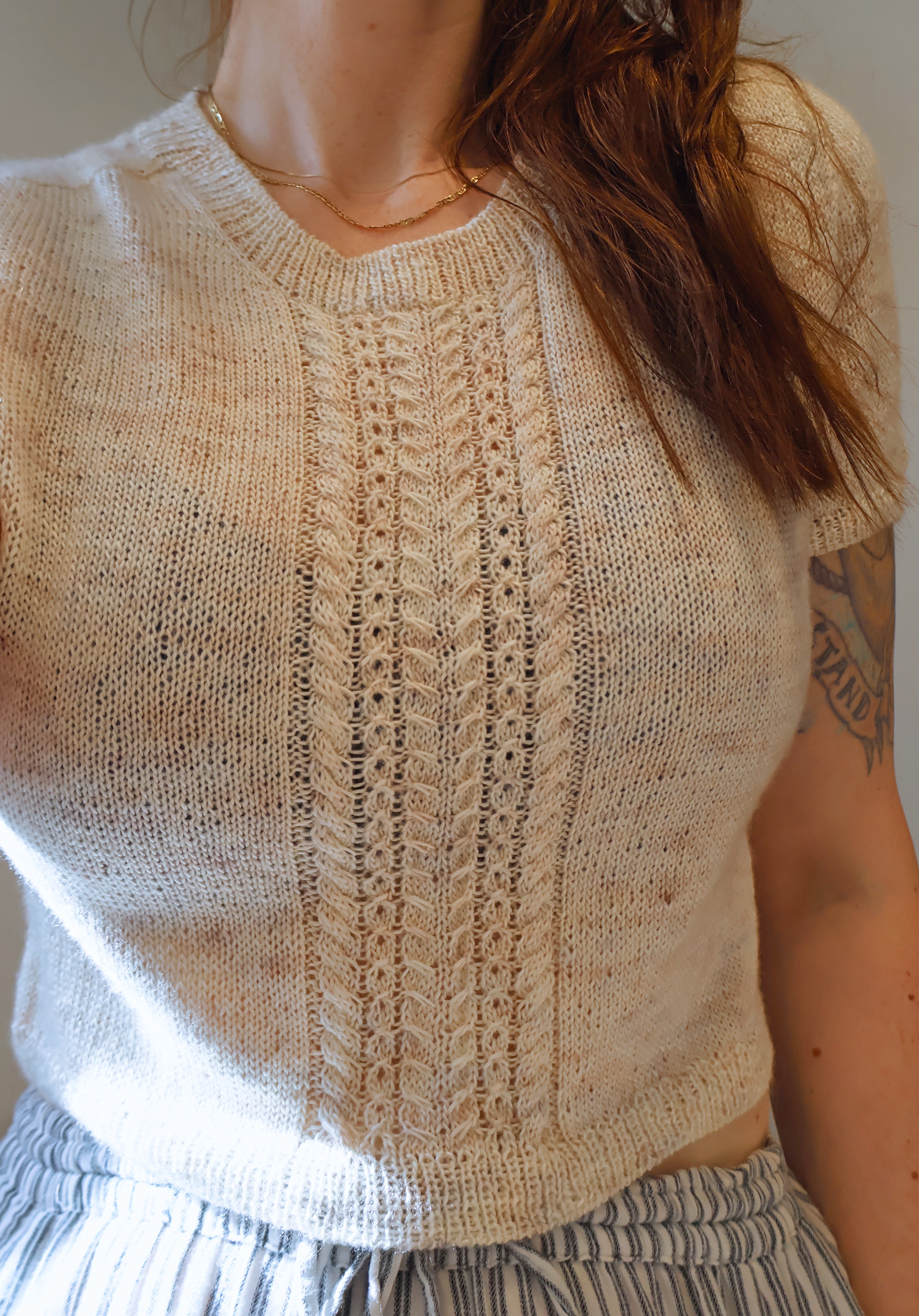 POTTER Tee er en slimfit cap sleeve t-shirt med saddelskulder og flot kabelmønster på fronten. Kablerne er perfekte, hvis man skal kaste sig ud i kabelstrik for første gang.