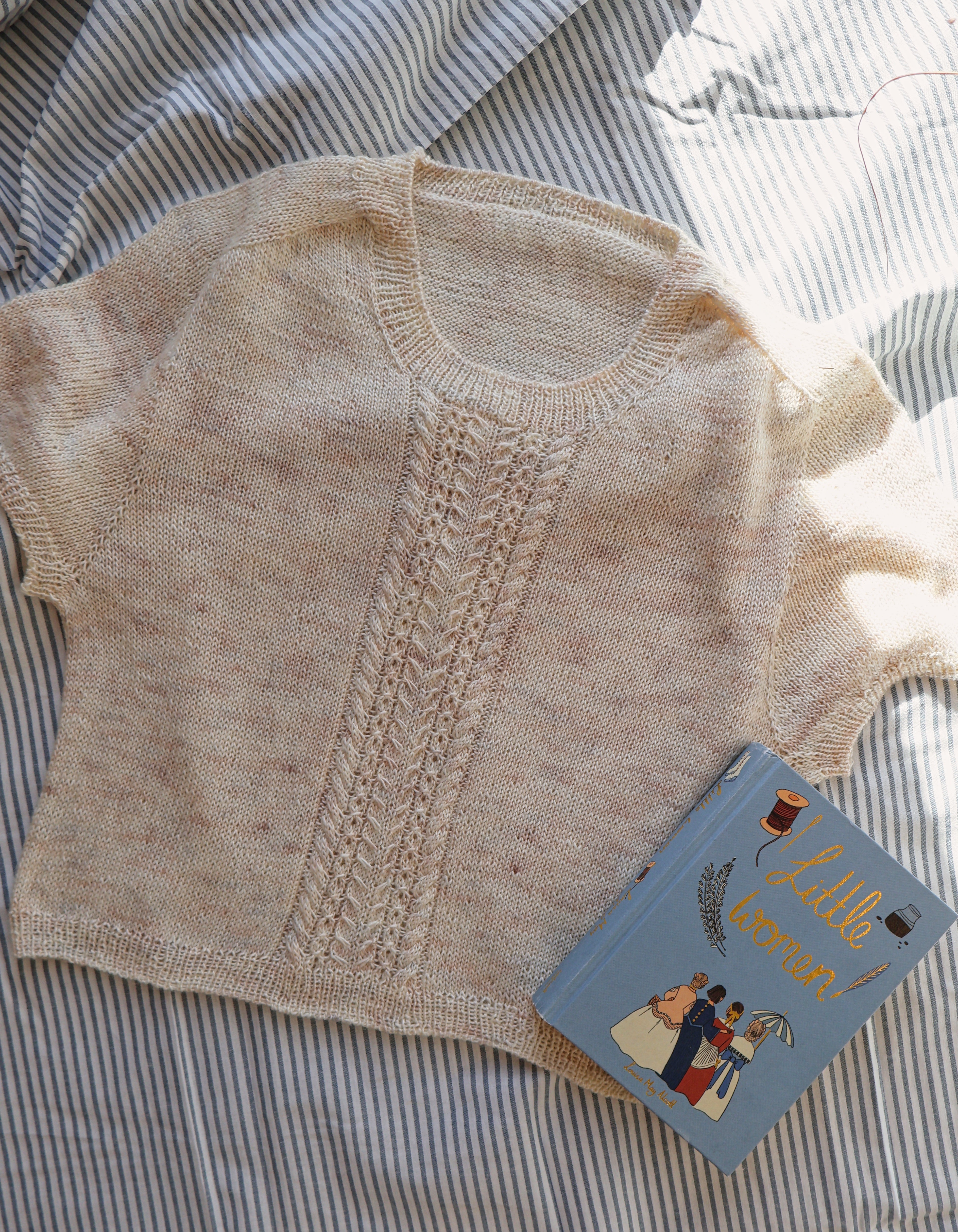 Den strikkes oppefra og ned, startende frem og tilbage. Derefter slås der masker op til forstykket og etableres et mønster der strikkes efter diagram. Den er tiltænkt at have et ease på -5 til +5 cm.